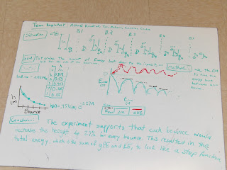 - These guys took some high-speed video as well, analyzing the heights of a bouncing ping-pong ball. In addition to modeling the height of the ball as a function of bounce (and making a slick argument that the exponential function implies a constant-percentage loss of energy (rather than a constant amount of energy lost), they used Logger Pro to graph the gravitational PE, kinetic energy, and total energy as a function of time, showing the expected constant total energy during each flight (well, a slight decline due to air resistance), with "steps down" in total energy following each bounce.